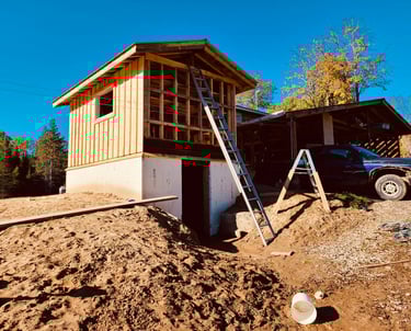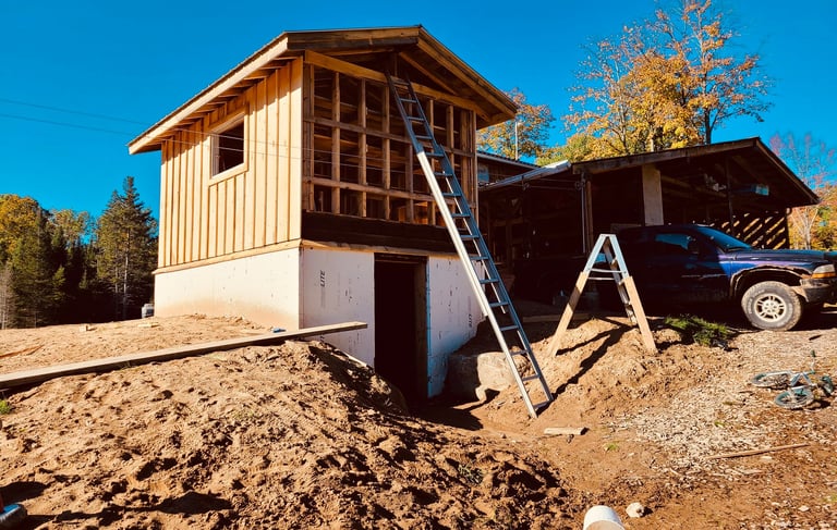 Our root cellar may just be one of a kind. In the ground, Ed dug out an area close to the house (beside our woodshed) with our excavator. The kids call her Elly. He then put footings down and laid cement blocks on those. He put rigid styrofoam on the outside of the blocks to insulate it, we want it to stay cool even in mid-summer! He buried all around the outside, and then instead of just putting a roof on that, he put a ceiling in. Then built a storage shed on top of it. It houses a tool bench, lots of empty canning jars, camping gear, and most importantly, our Inverter for our solar system. Down below, our root cellar houses root veggies from the garden, apples, and it is also where we store our off grid Batteries for our solar system.